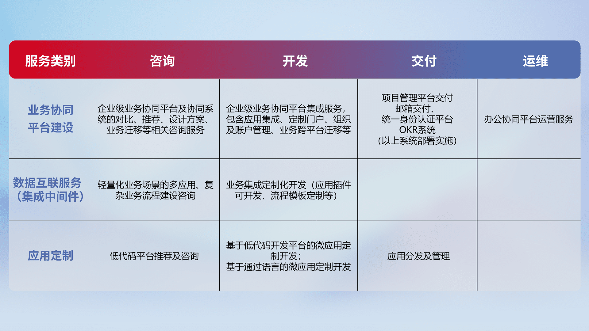 针对钉钉、、企微、、IDaas等平台级产品提供产品的规划、、方案、、、交付、、定制化开发等服务,,,,实现如统一协同办公、、、智能客户服务、、、、混合会议管理、、、、智能数据查询、、、等业务场景,,实现数字化转型。。。